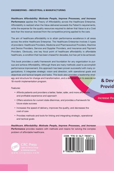Healthcare Affordability: Motivate People, Improve Processes, and Increase Performance applies the Theory of Affordability across the Healthcare Enterprise. Affordability is realized when the Value delivered exceeds the Patient's requirements, while the expense for the quality resources required to deliver that Value is at a Cost less than the revenue received from the competitive pricing applied to the care. The aim of healthcare affordability is to attain performance excellence in all areas across the entire Healthcare Enterprise. The Healthcare Enterprise involves 5 types of providers: Healthcare Providers, Medicine and Pharmaceutical Providers, Machine and Device Providers, Service and Supplier Providers, and Insurance and Payment Providers. Obviously, one key focal point of healthcare affordability is affordable healthcare, a condition that has been chased for decades, but has yet to be achieved. This book provides a useful framework and foundation for any organization to pursue and achieve Affordability. Although there are many methods used to accomplish performance improvement, this approach has been proven successful with many organizations. It integrates strategic vision and direction, with operational goals and objectives and tactical targets and tasks. This book also provides a leadership strategy and structure for change and transformation, and a designed plan to execute an 18-month implementation program. Features: Affords patients and providers a better, faster, safer, and more affordable and profitable experience and approach Offers solutions for current state dilemmas, and provides a framework for future state success Increases the speed of delivery, improves the quality, and decreases the cost of care Provides methods and tools for linking and integrating strategic, operational and tactical goals Healthcare Affordability: Motivate People, Improve Processes, and Increase Performance provides readers with methods and means for solving the complex problem of affordable healthcare.