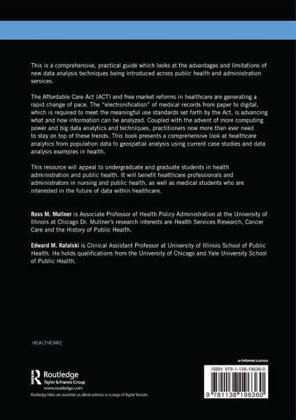This is a comprehensive, practical guide which looks at the advantages and limitations of new data analysis techniques being introduced across public health and administration services. The Affordable Care Act (ACT) and free market reforms in healthcare are generating a rapid change of pace. The "electronification" of medical records from paper to digital, which is required to meet the meaningful use standards set forth by the Act, is advancing what and how information can be analyzed. Coupled with the advent of more computing power and big data analytics and techniques, practitioners now more than ever need to stay on top of these trends. This book presents a comprehensive look at healthcare analytics from population data to geospatial analysis using current case studies and data analysis examples in health. This resource will appeal to undergraduate and graduate students in health administration and public health. It will benefit healthcare professionals and administrators in nursing and public health, as well as medical students who are interested in the future of data within healthcare.