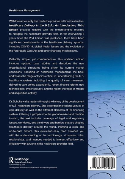 With the same clarity that made the previous editions bestsellers, Healthcare Delivery in the U.S.A.: An Introduction, Third Edition provides readers with the understanding required to navigate the healthcare provider field. In the intervening 8 years since the 2nd Edition was published, there have been significant developments in the healthcare delivery systems, including COVID-19, global health issues, and the evolution of the Affordable Care Act and other financing mechanisms. Brilliantly simple, yet comprehensive, this updated edition includes updated case studies and describes the new organizational structures being driven by current market conditions. Focusing on healthcare management, the book addresses the range of topics critical to understanding the U.S. healthcare system, including the quality of care movement, delivering care during a pandemic, recent finance reform, new technologies, cyber security, and the recent increase in merger and acquisition activity. Dr. Schulte walks readers through the history of the development of U.S. healthcare delivery. She describes the various venues of care delivery as well as the different elements of the financing system. Offering a glimpse into the global market and medical tourism, the text includes coverage of legal and regulatory issues, workforce, and the drivers and barriers that are shaping healthcare delivery around the world. Painting a clear and up-to-date picture, this quick-and-easy read provides you with the understanding of the terminology, structures, roles, relationships, and nuances needed to interact effectively and efficiently with anyone in the healthcare provider field.