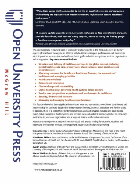 "This edition comes highly commended by me, it's an excellent reference and companion to developing the experience and expertise necessary to function in today's healthcare environment." Lord Victor O Adebowale MA CBE, Chair NHS Confederation, Leadership Coach, Executive Chairman, Visionable "A welcome update, given the even more acute challenges we face in healthcare and policy since the last edition, with new and timely chapters, edited by two of the leading groups in healthcare management and policy." Professor John Øvretveit, Medical Management Center, Karolinska Medical University, Sweden This internationally renowned book is written by leading experts in the field and covers all the key aspects of healthcare management. Written with healthcare managers, professionals and students in mind, it provides an accessible and evidence-based guide to healthcare systems, services, organisations and management. Key areas covered include: * Structure and delivery of healthcare services in the global context, including mental health, acute care, primary care, chronic disease, adult social care and integrated care * Allocating resources for healthcare: healthcare finances, the economics of healthcare and managing priorities * Healthcare workforce * Research and innovation * Climate change and sustainability * Global health policy: governing health systems across borders * Service user perspectives, experiences and involvements in healthcare * Equality, diversity and inclusion * Measuring and managing health care performance This fourth edition has been significantly rewritten, with two new editors, several new contributors and a revised chapter structure designed to better support learning, practical application and further study. In addition, there is a strengthened international focus, and each chapter includes new case studies giving global examples of health systems and services, new and updated learning activities to encourage application to your own organisation, and a range of links to useful online resources. Healthcare Management is essential research-based and applied reading for students, teachers and healthcare professionals involved in management, research and health policy making. Simon Moralee is Senior Lecturer/Associate Professor in Healthcare Management and Head of the Health Management Group at the Alliance Manchester Business School, The University of Manchester, UK. Manbinder Sidhu is Associate Professor at the Health Services Management Centre and Co-Director of the National Institute of Health and Care Research (NIHR) funded BRACE Rapid Evaluation Centre, the University of Birmingham, UK. Judith Smith is Professor of Health Policy and Management at the Health Services Management Centre, the University of Birmingham, UK and Director of Health Services Research, Birmingham Health Partners, UK. Kieran Walshe is Professor of Health Policy and Management at the Alliance Manchester Business School, The University of Manchester, UK.