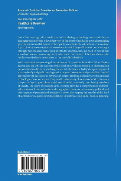 In healthcare, the realisation of an optimistic prognosis against pessimistic ones depends on current innovations in diagnostic and cost-effective treatment approaches being widely adopted in clinical practice. Utilisation of advanced early and predictive diagnostics, targeted prevention and personalised medical approaches could enable the elderly subpopulation to reach the 100-year age limit in good physical and mental health, as actively contributing members of society. This task requires intelligent political regulations and creation of new guidelines to advance current healthcare systems. In this book, we will collect contributions from several geopolitical regions of Europe, Asia and USA that provide expert opinion on healthcare organisation and outlook as well as economical aspects of personalised medicine.