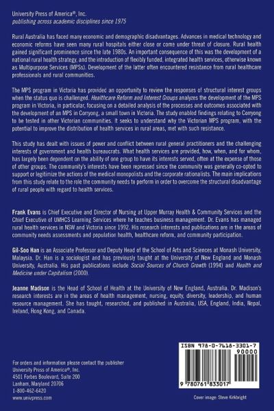 Rural Australia has faced many economic and demographic disadvantages. Advances in medical technology and economic reforms have led to the closure or near closure of many rural hospitals. Since the late 1980s, the Australian government has increased their focus on the quality and functionality of rural health. Most notable was the development of a rural health strategy and the introduction of flexibly funded, integrated health services, otherwise known as Multipurpose Services (MPS). Healthcare Reform and Interests Groups explores the resistance that the MPS's encountered from rural health professionals and rural communities and the critical role of these communities in Australia's healthcare reform.