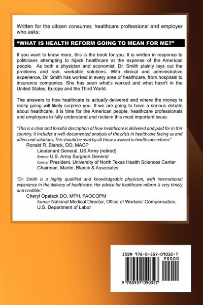 Written for the citizen consumer, healthcare professional and employer who asks: "What is health reform going to mean for me?" If you want to know more, this is the book for you. It is written in response to politicians attempting to hijack healthcare at the expense of the American people. As both a physician and economist, Dr. Smith plainly lays out the problems and real, workable solutions. With clinical and administrative experience, Dr. Smith has worked in every area of healthcare, from hospitals to insurance companies. She has seen what's worked and what hasn't in the United States, Europe and the Third World. The answers to how healthcare is actually delivered and where the money is really going will likely surprise you. If we are going to have a serious debate about healthcare, it is time for the American people, healthcare professionals and employers to fully understand and reclaim this most important issue.