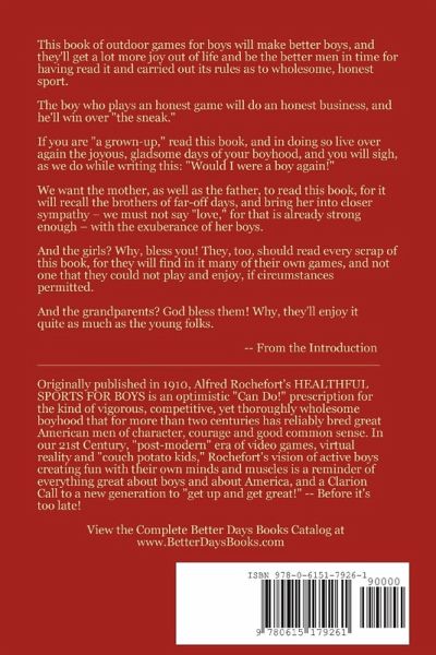 Originally published in 1910, Alfred Rochefort's HEALTHFUL SPORTS FOR BOYS is an optimistic "Can Do!" prescription for the kind of vigorous, competitive, yet thoroughly wholesome boyhood that for more than two centuries has reliably bred great American men of character, courage and good common sense. In our 21st Century, "post-modern" era of video games, virtual reality and "couch potato kids," Rochefort's vision of active boys creating fun with their own minds and muscles is a reminder of everything great about boys and about America, and a Clarion Call to a new generation to "get up and get great!" -- Before it's too late!