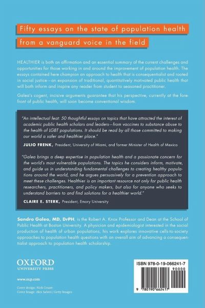 Fifty essays on the state of population health from a vanguard voice in the field Public health can rightly claim its share of victories: healthier cities, widespread sanitation, broader availability of nutrient-rich food, and reductions in violence and injury. But for all these gains, today we face a new set of challenges, ones complicated by political and professional shifts that threaten to fundamentally change the health of populations. Healthier is both an affirmation and an essential summary of the current challenges and opportunities for those working in and around the improvement of population health. The essays contained here champion an approach to health that is consequentialist and rooted in social justice -- an expansion of traditional, quantitatively motivated public health that will both inform and inspire any reader from student to seasoned practitioner. Galea's cogent, incisive arguments guarantee that his perspective, currently at the forefront of public health, will soon become conventional wisdom.