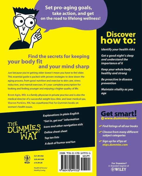 Introduction. Part I: So You Want to Look and Feel Young Forever. Chapter 1: The Fountain of Youth, at Your Fingertips. Chapter 2: The Four Major Health Concerns about Aging (and How to Prevent Them). Chapter 3: Evaluating Your Health and History and Setting Goals for Wellness. Part II: Workin' on Your Framework. Chapter 4: Putting Your Best Face Forward. Chapter 5: Loving the Skin You're In. Chapter 6: Building Bones and Preserving Joints. Part III: Using Nutrition to Extend Your Expiration Date. Chapter 7: You Are What You Eat: Nutrition 101. Chapter 8: Supplementing Your Daily Diet. Part IV: Getting Physical. Chapter 9: Maintaining a Healthy Weight and Fitness Level. Chapter 10: Strengthening Your Heart. Chapter 11: Building and Fine-Tuning Healthy Muscles. Part V: Sharpening the All-Important Mind and Spirit. Chapter 12: Keeping Your Mind and Memory in Tip-Top Shape. Chapter 13: Decreasing Stress to Live a Longer, Better Life. Chapter 14: ZZZ . . . The Infinite Importance of a Good Night's Sleep. Chapter 15: Don't Worry, Be Happy: The Keys to Maintaining Health and Vitality. Part VI: The Part of Tens. Chapter 16: Ten Medical Myths that Can Affect Your Health. Chapter 17: Ten Foods to Help You Age Healthfully. Chapter 18: Ten Mind Games to Boost Your Brainpower. Chapter 19: Ten Ways to Make Your Home Safer as You Age. Appendix: Health, Lifestyle, and History Self-Assessment. Index.