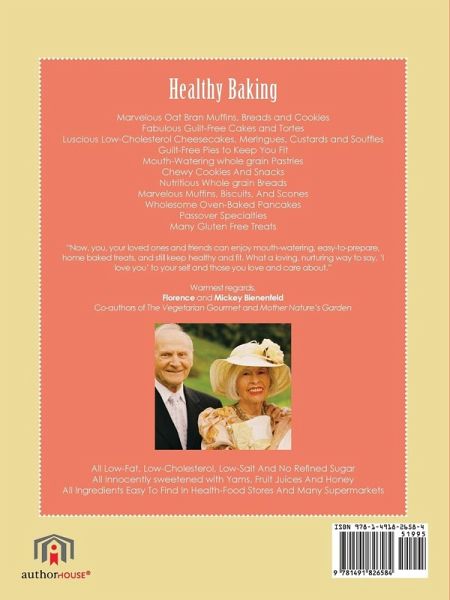 Healthy Baking Marvelous Oat Bran Muffins, Breads and Cookies Fabulous Guilt-Free Cakes and Tortes Luscious Low-Cholesterol Cheesecakes, Meringues, Custards and Souffles Guilt-Free Pies to Keep You Fit Mouth-Watering whole grain Pastries Chewy Cookies And Snacks Nutritious Whole grain Breads Marvelous Muffins, Biscuits, And Scones Wholesome Oven-Baked Pancakes Passover Specialties Many Gluten Free Treats "Now, you, your loved ones and friends can enjoy mouth-watering, easy-to-prepare, home baked treats, and still keep healthy and fit. What a loving, nurturing way to say, 'I love you' to your self and those you love and care about." Warmest regards, Florence and Mickey Bienenfeld Co-authors of The Vegetarian Gourmet and Mother Nature's Garden