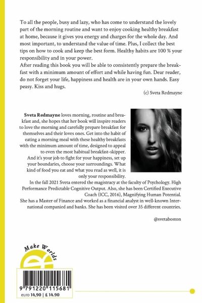 To all the people, busy and lazy, who has come to understand the lovely part of the morning routine and want to enjoy cooking healthy breakfast at home, because it gives you energy and charges for the whole day. And most important, to understand the value of time. Plus, I collect the best tips on how to cook and keep the best form. Healthy habits are 100 % your responsibility and in your power. After reading this book you will be able to consistently prepare the breakfast with a minimum amount of effort and while having fun. Dear reader, do not forget your life, happiness and health are in your own hands. Easy peasy. Kiss and hugs. (¿) Sveta Redmayne Sveta Redmayne loves morning, routine and breakfast and, she hopes that her book will inspire readers to love the morning and carefully prepare breakfast for themselves and their loves ones. Get into the habit of eating a morning meal with these healthy breakfasts with the minimum amount of time, designed to appeal to even the most habitual breakfast-skipper. And it's your job to fight for your happiness, set up your boundaries, choose your surroundings. What kind of food you eat and what you read as well, it is only your responsibility. In the fall 2021 Sveta entered the magistracy at the faculty of Psychology. High Performance Predictable Cognitive Output. Also, she has been Certified Executive Coach (ICC, 2016), Magnifying Human Potential. She has a Master of Finance and worked as a financial analyst in well-known International companied and banks. She has been visited over 35 different countries.