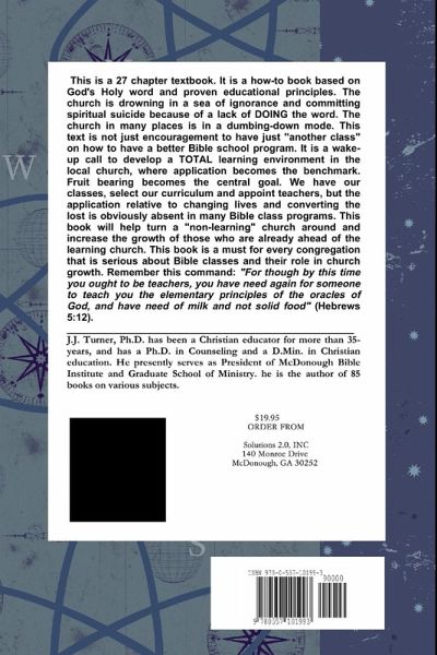 This is a 27 chapter textbook. It is a how-to book based on God's Holy word and sound educational principles. The church is drowning in a sea of ignorance and committing spiritual suicide because of a lack of doing the word. The church in many places is in a dumbing-down mode. This is not just an encouragement to have "another class" on how to have better Bible school programs or classes. It is a wakeup call to develop a TOTAL learning environment in each church, where application becomes the benchmark. Fruit bearing becomes the central goal. We have our classes, select our curriculum and appoint teachers, but the applicaiton relative to changing lives and converting the lost is obviously absent in many churches. This book will help turn a "non-leanring" church around and increase the growth of those who are already ahead of the learning curve. This book is a must for every congregation that is serious about Bible classes and their role in church growth.