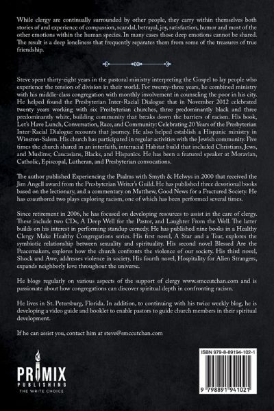 Biography for Steve McCutchansteve@smccutcacan Steve spent thirty-eight years in the pastoral ministry interpreting the Gospel to lay people who experience the tension of division in their world. For twenty-three years, he combined ministry with his middle-class congregation with monthly involvement in counseling the poor in his city. He helped found the Presbyterian Inter-Racial Dialogue that in November 2012 celebrated twenty years working with six Presbyterian churches, three predominantly black and three predominantly white, building cprimixommunity that breaks down the barriers of racism. His book, Let's Have Lunch, Conversation, Race, and Community: Celebrating 20 Years of the Presbyterian Inter-Racial Dialogue recounts that journey. He also helped establish a Hispanic ministry in Winston-Salem. His church has participated in regular activities with the Jewish community. Five times the church shared in an interfaith, interracial Habitat build that included Christians, Jews, and Muslims; Caucasians, Blacks, and Hispanics. He has been a featured speaker at Moravian, Catholic, Episcopal, Lutheran, and Presbyterian convocations.The author published Experiencing the Psalms with Smyth & Helwys in 2000 that received the Jim Angell award from the Presbyterian Writer's Guild. He has published three devotional books based on the lectionary, and a commentary on Matthew, Good News for a Fractured Society. He has coauthored two plays exploring racism, one of which has been performed several times. Since retirement in 2006, he has focused on developing resources to assist in the care of clergy. These include two CDs, A Deep Well for the Pastor, and Laughter From the Well. The latter builds on his interest in performing standup comedy. He has published nine books in a Healthy Clergy Make Healthy Congregations series. His first novel, A Star and a Tear, explores the symbiotic relationship between sexuality and spirituality. His second novel Blessed Are the Peacemakers, explores how the church confronts the violence of our society. His third novel, Shock and Awe, addresses violence in society. His fourth novel, Hospitality for Alien Strangers, expands neighborly love throughout the universe. He blogs regularly on various aspects of the support of clergy www.smccutchan.com and is passionate about how congregations can discover spiritual depth in confronting racism.He lives in St. Petersburg, Florida. In addition, to continuing with his twice weekly blog, he is developing a video guide and booklet to enable pastors to guide church members in their spiritual development. If he can assist you, contact him at steve@smccutchan.com
