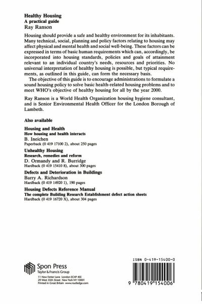 The objective of this book is to encourage administrations to formulate a sound housing policy to solve basic health-related housing problems and to meet WHO's objective of healthful housing for all by the year 2000. The principles of healthy housing have universal applicability, as most countries of the developed world have areas of slum or otherwise insanitary housing. It is hoped that this guide will be used extensively as a reference to basic health requirements for new housing and human settlements and as a guide for assessing the hygienic quality of existing housing. The book would sit well alongside inter-professional and community education programmes.