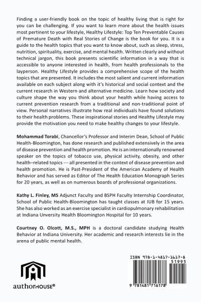 Finding a user-friendly book on the topic of healthy living that is right for you can be challenging. If you want to learn more about the health issues most pertinent to your lifestyle, Healthy Lifestyle: Top Ten Preventable Causes of Premature Death with Real Stories of Change is the book for you. It is a guide to the health topics that you want to know about, such as sleep, stress, nutrition, spirituality, exercise, and mental health. Written clearly and without technical jargon, this book presents scientific information in a way that is accessible to anyone interested in health, from health professionals to the layperson. Healthy Lifestyle provides a comprehensive scope of the health topics that are presented. It includes the most salient and current information available on each subject along with it's historical and social context and the current research in Western and alternative medicine. Learn how society and culture shape the way you think about your health while having access to current prevention research from a traditional and non-traditional point of view. Personal narratives illustrate how real individuals have found solutions to their health problems. These inspirational stories and Healthy Lifestyle may provide the motivation you need to make healthy changes to your lifestyle.