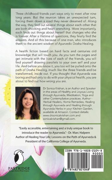 Three childhood friends part ways only to meet after nine long years. But the reunion takes an unexpected turn, forcing them down a road they never dreamed of. Along the way, they find out several things about each other that are both shocking and heart-wrenching. More importantly, each finds out things about herself that change who she is forever. After a lifetime of questions, they finally find the answers. And all this because of one man who introduces them to the ancient wisdom of ayurvedic dosha healing. A health fiction based on hard facts and centuries' old knowledge that will touch you. As you turn the pages and get intimate with the lives of each of the friends, you will find yourself drawing parallels to your own self and your life. And before you know it, you too will be pulled onto the path of dosha healing, much like the three friends, and be transformed inside out. If you thought that ayurveda was boring and had only to do with your physical health, you are about to find out how wrong you are.