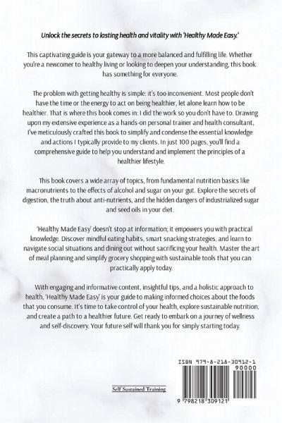 Unlock the secrets to lasting health and vitality with 'Healthy Made Easy.' This captivating guide is your gateway to a more balanced and fulfilling life. Whether you're a newcomer to healthy living or looking to deepen your understanding, this book has something for everyone. The problem with getting healthy is simple: it's too inconvenient. Most people don't have the time or the energy to act on being healthier, let alone learn how to be healthier. That is where this book comes in: I did the work so you don't have to. Drawing upon my extensive experience as a hands-on personal trainer and health consultant, I've meticulously crafted this book to simplify and condense the essential knowledge and actions I typically provide to my clients. In just 100 pages, you'll find a comprehensive guide to help you understand and implement the principles of a healthier lifestyle. This book covers a wide array of topics, from fundamental nutrition basics like macronutrients to the effects of alcohol and sugar on your gut. Explore the secrets of digestion, the truth about anti-nutrients, and the hidden dangers of industrialized sugar and seed oils in your diet. 'Healthy Made Easy' doesn't stop at information; it empowers you with practical knowledge. Discover mindful eating habits, smart snacking strategies, and learn to navigate social situations and dining out without sacrificing your health. Master the art of meal planning and simplify grocery shopping with sustainable tools that you can practically apply today. With engaging and informative content, insightful tips, and a holistic approach to health, 'Healthy Made Easy' is your guide to making informed choices about the foods that you consume. It's time to take control of your health, explore sustainable nutrition, and create a path to a healthier future. Get ready to embark on a journey of wellness and self-discovery. Your future self will thank you for simply starting today.
