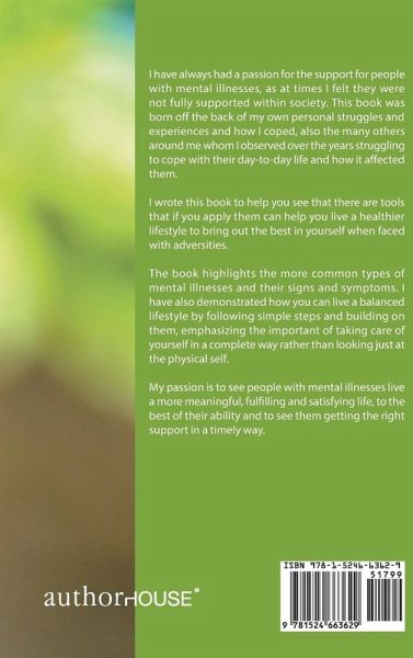 I have always had a passion for the support for people with mental illnesses, as at times I felt they were not fully supported within society. This book was born off the back of my own personal struggles and experiences and how I coped, also the many others around me whom I observed over the years struggling to cope with their day-to-day life and how it affected them. I wrote this book to help you see that there are tools that if you apply them can help you live a healthier lifestyle to bring out the best in yourself when faced with adversities. The book highlights the more common types of mental illnesses and their signs and symptoms. I have also demonstrated how you can live a balanced lifestyle by following simple steps and building on them, emphasizing the important of taking care of yourself in a complete way rather than looking just at the physical self. My passion is to see people with mental illnesses live a more meaningful, fulfilling and satisfying life, to the best of their ability and to see them getting the right support in a timely way.