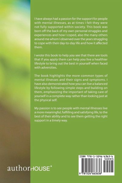 I have always had a passion for the support for people with mental illnesses, as at times I felt they were not fully supported within society. This book was born off the back of my own personal struggles and experiences and how I coped, also the many others around me whom I observed over the years struggling to cope with their day-to-day life and how it affected them. I wrote this book to help you see that there are tools that if you apply them can help you live a healthier lifestyle to bring out the best in yourself when faced with adversities. The book highlights the more common types of mental illnesses and their signs and symptoms. I have also demonstrated how you can live a balanced lifestyle by following simple steps and building on them, emphasizing the important of taking care of yourself in a complete way rather than looking just at the physical self. My passion is to see people with mental illnesses live a more meaningful, fulfilling and satisfying life, to the best of their ability and to see them getting the right support in a timely way.