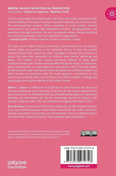 Steven J. Taylor is a Wellcome Trust ISSF Early Career Fellow in the History of Poverty and Medicine at the University of Leicester, UK. His research explores ideas and constructions of childhood health, lay and professional diagnoses, ability and disability, and institutional care. His first monograph, Beyond the Asylum: Child Insanity in England, 1845-1907, was published by Palgrave Macmillan in 2017. Alice Brumby is a Lecturer at York St John University, UK. Her research interests focus upon twentieth century mental health care and the role of the community, families and patients in accessing care and treatment. She has published work in First World War Studies and History Today amongst other publications.