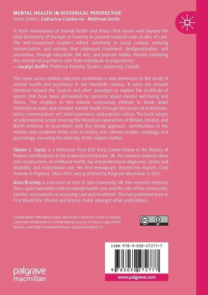 This open access edited collection contributes a new dimension to the study of mental health and psychiatry in the twentieth century. It takes the present literature beyond the 'asylum and after' paradigm to explore the multitude of spaces that have been permeated by concerns about mental well-being and illness. The chapters in this volume consciously attempt to break down institutional walls and consider mental health through the lenses of institutions, policy, nomenclature, art, lived experience, and popular culture. The book adopts an international scope covering the historical experiences of Britain, Ireland, and North America. In accordance with this broad approach, contributions to the volume span academic fields such as history, arts, literary studies, sociology, and psychology, mirroring the diversity of the subject matter.
