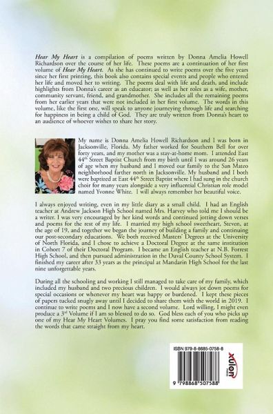 Hear My Heart is a compilation of poems written by Donna Amelia Howell Richardson over the course of her life. These poems are a continuation of her first volume of Hear My Heart. As she has continued to write poems over the five years since her first printing, this book also contains special events and people who entered her life and moved her to writing. The poems deal with life and death, and include highlights from Donna's career as an educator; as well as her roles as a wife, mother, community servant, friend, and grandmother. She includes all the remaining poems from her earlier years that were not included in her first volume. The words in this volume, like the first one, will speak to anyone journeying through life and searching for happiness in being a child of God. They are truly written from Donna's heart to an audience of whoever wishes to share her story. My name is Donna Amelia Howell Richardson and I was born in Jacksonville, Florida. My father worked for Southern Bell for over forty years, and my mother was a stay-at-home mom. I attended East 44th Street Baptist Church from my birth until I was around 26 years of age when my husband and I moved our family to the San Mateo neighborhood farther north in Jacksonville. My husband and I both were baptized at East 44th Street Baptist where I had sung in the church choir for many years alongside a very influential Christian role model named Yvonne White. I will always remember her beautiful voice. I always enjoyed writing, even in my little diary as a small child. I had an English teacher at Andrew Jackson High School named Mrs. Harvey who told me I should be a writer. I was very encouraged by her kind words and continued jotting down verses and poems for the rest of my life. I married my high school sweetheart, Steven, at the age of 19, and together we began the journey of building a family and continuing our post-secondary educations. We both received Masters' Degrees at the University of North Florida, and I chose to achieve a Doctoral Degree at the same institution in Cohort 7 of their Doctoral Program. I became an English teacher at N.B. Forrest High School, and then pursued administration in the Duval County School System. I finished my career after 33 years as the principal at Mandarin High School for the last nine unforgettable years. During all the schooling and working I still managed to take care of my family, which included my husband and two precious children. I would always jot down poems for special occasions or whenever my heart was happy or burdened. I kept these pieces of papers tucked snugly away until I decided to share them with the world in 2019. I continue to write poems and I now have a second volume. Lord willing, I might even produce a 3rd Volume if I am so blessed to do so. God bless each of you who picks up one of my Hear My Heart Volumes. I pray you find some satisfaction from reading the words that came straight from my heart.