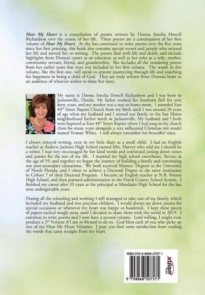 Hear My Heart is a compilation of poems written by Donna Amelia Howell Richardson over the course of her life. These poems are a continuation of her first volume of Hear My Heart. As she has continued to write poems over the five years since her first printing, this book also contains special events and people who entered her life and moved her to writing. The poems deal with life and death, and include highlights from Donna's career as an educator; as well as her roles as a wife, mother, community servant, friend, and grandmother. She includes all the remaining poems from her earlier years that were not included in her first volume. The words in this volume, like the first one, will speak to anyone journeying through life and searching for happiness in being a child of God. They are truly written from Donna's heart to an audience of whoever wishes to share her story. My name is Donna Amelia Howell Richardson and I was born in Jacksonville, Florida. My father worked for Southern Bell for over forty years, and my mother was a stay-at-home mom. I attended East 44th Street Baptist Church from my birth until I was around 26 years of age when my husband and I moved our family to the San Mateo neighborhood farther north in Jacksonville. My husband and I both were baptized at East 44th Street Baptist where I had sung in the church choir for many years alongside a very influential Christian role model named Yvonne White. I will always remember her beautiful voice. I always enjoyed writing, even in my little diary as a small child. I had an English teacher at Andrew Jackson High School named Mrs. Harvey who told me I should be a writer. I was very encouraged by her kind words and continued jotting down verses and poems for the rest of my life. I married my high school sweetheart, Steven, at the age of 19, and together we began the journey of building a family and continuing our post-secondary educations. We both received Masters' Degrees at the University of North Florida, and I chose to achieve a Doctoral Degree at the same institution in Cohort 7 of their Doctoral Program. I became an English teacher at N.B. Forrest High School, and then pursued administration in the Duval County School System. I finished my career after 33 years as the principal at Mandarin High School for the last nine unforgettable years. During all the schooling and working I still managed to take care of my family, which included my husband and two precious children. I would always jot down poems for special occasions or whenever my heart was happy or burdened. I kept these pieces of papers tucked snugly away until I decided to share them with the world in 2019. I continue to write poems and I now have a second volume. Lord willing, I might even produce a 3rd Volume if I am so blessed to do so. God bless each of you who picks up one of my Hear My Heart Volumes. I pray you find some satisfaction from reading the words that came straight from my heart.