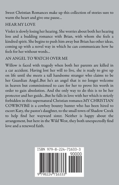 Sweet Christian Romances make up this collection of stories sure to warm the heart and give one pause... HEAR MY LOVE Violet is slowly losing her hearing. She worries about both her hearing loss and a budding romance with Brian, with whom she feels a kindred spirit. She begins to push him away but Brian has other ideas, coming up with a novel way in which he can communicate how he feels for her without words... AN ANGEL TO WATCH OVER ME Willow is faced with tragedy when both her parents are killed in a car accident. Having lost her will to live, she is ready to give up on life until she meets a tall handsome stranger who claims to be her Guardian Angel..But he's an angel that is no longer welcome in heaven but commissioned to care for her to prove his worth in order to gain absolution. And the only way to do this is to be her protector and her guide...But he falls in love with her which is strictly forbidden in this supernatural Christian romance.MY CHRISTIAN COWBOYBill is a cowboy bounty hunter who has been hired to escort Katy, the pastor's daughter, to the small town of Shadow Creek to help find her wayward sister. Neither is happy about the arrangement, but here in the Wild West, they both unexpectedly find love and a renewed faith.