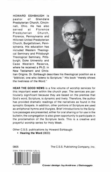 Hear the Good News is a fine volume of worship services for this important week within the church year. The services are particularly significant because they are based on the premise that God's word, scripture, is dynamic and lively. Therefore, the author has provided dramatic readings of the narratives as found in the synoptic gospels. In addition, other portions of scripture are used as antiphonal hymns and liturgies. Brief introductions to the scripture passages are presented, either for oral sharing or for use in the bulletin; the congregation is also given opportunity to participate in the proclamation of the scripture texts. This is a creative and prayerful worship series for Holy Week. Howard Eshbaugh is pastor of Glendale Presbyterian Church, Cincinnati, Ohio. He has also served at Florence Presbyterian Church, Florence, Pennsylvania, and Hillcrest United Presbyterian Church, Burgettstown, Pennsylvania. His education has included Western Theological Seminary and Pittsburgh Theological Seminary, Pittsburgh; Duke University and Case Western Reserve, where he received a Ph.D. in New Testament and Christian Origins. Dr. Eshbaugh describes his theological position as a "biblicist, one who listens to scripture." His book "merely shows the liveliness of the word."