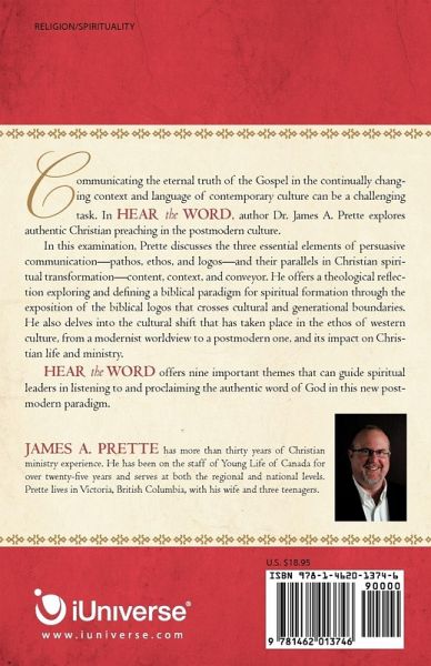Communicating the eternal truth of the Gospel in the continually changing context and language of contemporary culture can be a challenging task. In HEAR the WORD, author Dr. James A. Prette explores authentic Christian preaching in the postmodern culture. In this examination, Prette discusses the three essential elements of persuasive communication-pathos, ethos, and logos-and their parallels in Christian spiritual transformation-content, context, and conveyor. He offers a theological reflection exploring and defining a biblical paradigm for spiritual formation through the exposition of the biblical logos that crosses cultural and generational boundaries. He also delves into the cultural shift that has taken place in the ethos of western culture, from a modernist worldview to a postmodern one, and its impact on Christian life and ministry. HEAR the WORD offers nine important themes that can guide spiritual leaders in listening to and proclaiming the authentic word of God in this new postmodern paradigm.