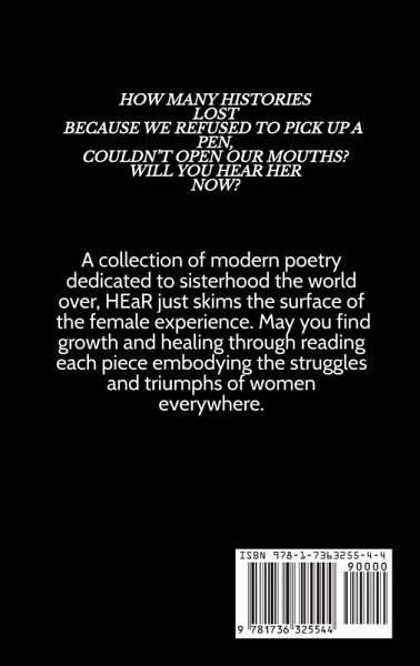 How many historiesLostBecause we refused to pick up a pen,Couldn't open our mouths?Will you hear herNow? A collection of modern poetry dedicated to sisterhood the world over, HEaR just skims the surface of the female experience. May you find growth and healing through reading each piece embodying the struggles and triumphs of women everywhere.