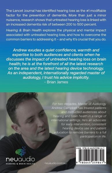 The Lancet Journal has identified hearing loss as the #1 modifiable factor for the prevention of dementia. 'Modifiable' meaning there is something you can do about it. More than just a minor nuisance, research shows that untreated hearing loss is linked with an increased dementia risk of between 200 to 500 percent. Hearing and Brain Health explores the physical and mental impact associated with untreated hearing loss, and how to overcome the common barriers to addressing it - and why it's crucial that you do. "Andrew exudes a quiet confidence, warmth and expertise to both audiences and clients when he discusses the impact of untreated hearing loss on brain health; he is at the forefront of all the latest research on the area and the latest hearing device technology. As an independent, internationally regarded master of audiology, I trust his advice implicitly." ~Brian James "Luckily for me I heard a family friend singing Andrew's praises about his success in relation to hearing loss, so I contacted his clinic for an appointment. I can now say it was the best decision I could have made. My advice to anyone who has hearing loss is to contact an audiology professional. As for me, I was so lucky to have found Andrew Campbell. He and his team are definitely the professionals in this field, and it is with great confidence that I recommend him and his team." ~Judith Cush "We heard that Andrew was an independent audiologist and therefore free to prescribe whatever he thinks is suitable for each of his patients. The whole experience has been a revelation. Andrew quickly determined my hearing issues during that first appointment, and recommended very neat and discreet hearing aids. They were life-enhancing right from the start. I would recommend Andrew without hesitation as a caring, extremely knowledgeable professional who works with you to obtain the best results possible." ~Gary James