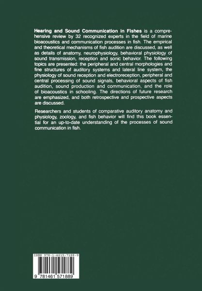 One Form and Function.- 1 Fine Structure and Function of the Ear (With 10 Figures).- 2 Acousticolateralis System in Clupeid Fishes (With 7 Figures).- 3 The Swimbladder and Hearing (With 9 Figures).- 4 The Utricle in Ictalurus punctatus (With 3 Figures).- 5 Audition in Elasmobranchs (With 17 Figures).- Two Auditory Capabilities and Psychophysics.- 6 The Hearing Abilities of Fish (With 7 Figures).- 7 Segregation of Directional and Nondirectional Acoustic Information in the Cod (With 6 Figures).- 8 Interspecific Differences in Hearing Capabilities for Select Teleost Species (With 2 Figures).- 9 Neurophysiological Mechanisms of Intensity Discrimination in the Goldfish (With 5 Figures).- Three Physiological Mechanisms of the Ear.- 10 Coding of Acoustic Information in the Eighth Nerve (With 16 Figures).- 11 Frequency Characteristics of Primary Auditory Neurons from the Ear of the Cod, Gadus morhua L. (With 12 Figures).- 12 Frequency Discrimination in Teleosts-Central or Peripheral? (With 5 Figures).- 13 Mismatch between Sound Production and Hearing in the Oyster Toadfish (With 1 Figure).- Four Sound Source Localization.- 14 Models of Acoustic Localization (With 14 Figures).- 15 Directional Characteristics of Primary Auditory Neurons from the Cod Ear (With 10 Figures).- Five Central Nervous System.- 16 Audition and the Central Nervous System of Fishes (With 8 Figures).- 17 Central Processing of Acousticolateralis Signals in Elasmobranchs (With 7 Figures).- 18 Comparative Neuroanatomy of the Octavolateralis Area of Fishes (With 2 Figures).- 19 Some Central Connections of Medullary Octavolateral Centers in a Mormyrid Fish (With 3 Figures).- Six Sound Production and Acoustical Behavior.- 20 Sound Communication and Interception in Fishes.- 21 Neural Control of Teleost SoundProduction (With 9 Figures).- 22 Sound Production in the Naked Goby, Gobiosoma bosci (Pisces, Gobiidae)-A Preliminary Study (With 6 Figures).- Seven Lateral Line System.- 23 The Lateral Une and Sound Reception (With 11 Figures).- 24 Stimulation of Lateral-Line Sensory Cells (With 7 Figures).- 25 Modeling the Effects of Stimulus Frequency and Intensity on Hair Cell Potentials (With 4 Figures).- 26 Lateral Line Function and the Internal Dynamics of Fish Schools (With 1 Figure).- Eight Prospectives.- 27 Comparisons of the Electric and Acoustic Senses and their Central Processing (With 14 Figures).- 28 Retrospect and Prospect-Listening through a Wet Filter.- Author Index.