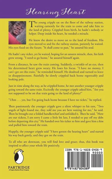 The young cripple sat on the floor of the railway station, waiting earnestly for the train to come and take him to the land of plenty. Crippled from birth, he hadn't nobody or helper. Deep inside his heart, he needed a miracle. He knew the desire to move on to the land of freedom. His eyes moved to and fro the railway station, patiently he waited. His eyes fixed on the future. "It shall come to past," he assured his soul. He hadn't any ticket, yet he waited, hoping for an unseen miracle, then, his faith grew strong. "I need to go home," he assured himself again. From a distance, he saw the train coming. Suddenly, a twinkle of an eye, then his determined heart grew weary. He loses his focus. "I have no money, I can't get on this train," he reminded himself. He doubted and turned to leave in disappointment. Painfully he slowly crippled back home regrettably and looking pale. Just in time along the way, as he crippled home, he met another younger cripple going toward the same train. Excitedly the younger cripple asked him, "Are you not supposed to be on that train going to the land of plenty?" "Uhm . . . yes, but I'm going back home because I have no ticket," he replied. Then passionately the younger cripple gave a silent whisper to his ears, "Two angels of light found me, they told me you are here waiting for me," he said. Then he brought out a folded handkerchief and unfolded it. Then he said, ''Here are our tickets, I am sorry I came a little bit late, I needed to pay off my debt before departing this city." He handed over his ticket to him and gave him a kiss and pulled him toward the train. Happily, the younger cripple said "I have gotten the hearing heart" and started his way back gently, and they got on the train. To all who are downcast, you will find love and grace; thus, this book was inspired to affect your whole life positively.