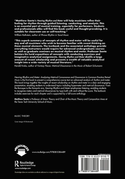 Hearing Rhythm and Meter: Analyzing Metrical Consonance and Dissonance in Common-Practice Period Music is the first book to present a comprehensive course text on advanced analysis of rhythm and meter. This book brings together the insights of recent scholarship on rhythm and meter in a clear and engaging presentation, enabling students to understand topics including hypermeter and metrical dissonance. From the Baroque to the Romantic era, Hearing Rhythm and Meter emphasizes listening, enabling students to recognize meters and metrical dissonances by type both with and without the score. The textbook includes exercises for each chapter and is supported by a full-score anthology. PURCHASING OPTIONS Textbook (Print Paperback): 978-0-8153-8448-9 Textbook (Print Hardback): 978-0-8153-8447-2 Textbook (eBook): 978-1-351-20431-6 Anthology (Print Paperback): 978-0-8153-9176-0 Anthology (Print Hardback): 978-0-367-34924-0 Anthology (eBook): 978-1-351-20083-7