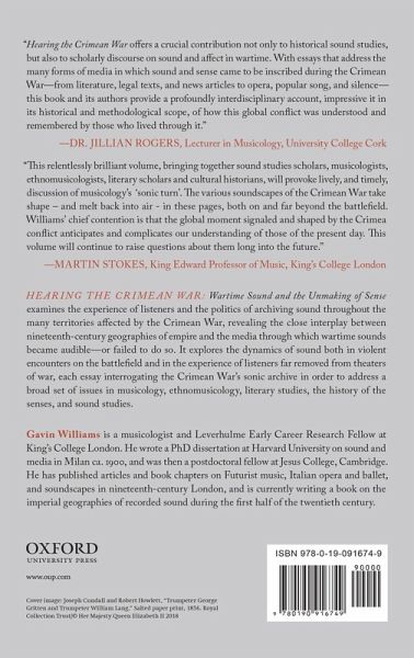 Hearing the Crimean War: Wartime Sound and the Unmaking of Sense examines the experience of listeners and the politics of archiving sound throughout the many territories affected by the Crimean War, revealing the close interplay between nineteenth-century geographies of empire and the media through which wartime sounds became audible--or failed to do so.