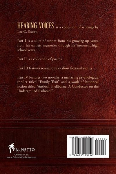 HEARING VOICES is a collection of writings by Lee C. Stuart. Part I is a suite of stories from his growing-up years, from his earliest memories through his irreverent high school years. Part II is a collection of poems. Part III features several quirky short fictional stories. Part IV features two novellas: a menacing psychological thriller titled "Family Trait" and a work of historical fiction titled "Antioch Shellburne, A Conductor on the Underground Railroad."