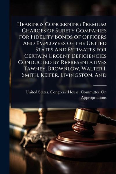 This volume contains the official record of hearings conducted by the United States House Committee on Appropriations in 1909. The hearings concern the premium charges of surety companies for fidelity bonds required of officers and employees of the United States government. It also includes estimates for certain urgent deficiencies. Representatives Tawney, Brownlow, Walter I. Smith, Keifer, Livingston, and others presided over the proceedings, carefully examining the financial arrangements and safeguards surrounding government bonding practices. This historical document offers valuable insights into the financial oversight mechanisms of the early 20th century United States government and the relationship between the government and the private surety industry. It provides a detailed account of the concerns and considerations involved in ensuring the financial integrity of government operations and protecting public funds. This work has been selected by scholars as being culturally important, and is part of the knowledge base of civilization as we know it. This work was reproduced from the original artifact, and remains as true to the original work as possible. Therefore, you will see the original copyright references, library stamps (as most of these works have been housed in our most important libraries around the world), and other notations in the work. This work is in the public domain in the United States of America, and possibly other nations. Within the United States, you may freely copy and distribute this work, as no entity (individual or corporate) has a copyright on the body of the work. As a reproduction of a historical artifact, this work may contain missing or blurred pages, poor pictures, errant marks, etc. Scholars believe, and we concur, that this work is important enough to be preserved, reproduced, and made generally available to the public. We appreciate your support of the preservation process, and thank you for being an important part of keeping this knowledge alive and relevant.