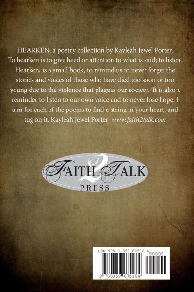 HEARKEN, a poetry collection by Kayleah Jewel Porter. To hearken is to give heed or attention to what is said; to listen. Hearken, is a small book, to remind us to never forget the stories and voices of those who have died too soon or too young due to the violence that plagues our society. It is also a reminder to listen to our own voice and to never lose hope.