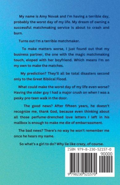 My name is Amy Novak and I'm having a terrible day, probably the worst day of my life. My dream of owning a successful matchmaking service is about to crash and burn. Turns out I'm a terrible matchmaker. To make matters worse, I just found out that my business partner, the one with the magic matchmaking touch, eloped with her boyfriend. Which means I'm on my own to make the matches. My prediction? They'll all be total disasters second only to the Great Biblical Flood. What could make the worst day of my life even worse? Having the older guy I had a major crush on when I was a pesky pre-teen walk in the door. The good news? After fifteen years, he doesn't recognize me, thank God, because even thinking about all those perfume-drenched love letters I left in his mailbox is enough to make me die of embarrassment. The bad news? There's no way he won't remember me once he hears my name. So what's a girl to do? Why lie like crazy, of course.