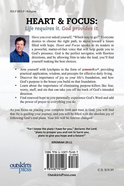HEART AND FOCUS Life Requires it. God Provides it. You will be drawn closer to God through this author's use of aCROSStic, unique word formulas based on God's truth and teachings, created with God's direction, and anointed to inspire you to bring the power of the cross into your daily activities. Whatever challenge, problem, or life experience you are grappling with today, HEART AND FOCUS will bring about a new level of confidence and assurance in God's ability to positively change your circumstances. HEART AND FOCUS speaks to its readers in a powerful, matter of fact voice that draws you into God's presence. Arm yourself with lynchpins in the form of aCROSStic for practical application, wisdom, and ideas for daily living. In every chapter, you will feel as though you are spending personal time with your heavenly Father who wants to make you "the absolute best you can be!" From learning about the importance of JOY being your life's foundation to God's PURPOSE being the house you build on your foundation. You will learn about the importance of eliminating purpose killers in your life like FEAR, WORRY, STUFF, and SIN that can take you well off the track of God's intended direction for your life. Ultimately, at many different times in life, we must answer the question of; "Which Way to Go?" Everyone desires to choose the right path, to "set up" our future and fill it with hope. The list of questions regarding knowing "Which Way to Go?" never ends as life is an endless queue of choices each and every day. Just how many times in life will you come to a fork in the road and find that you must choose a path. Hundreds? Thousands? Who really knows? God knows, and He has an answer and a direction for us to take at every fork in the road. By the time you have finished reading HEART AND FOCUS, you will know there is HOPE for your life by applying God's WORD and adding the power of PRAYER to every decision you are making for your life.