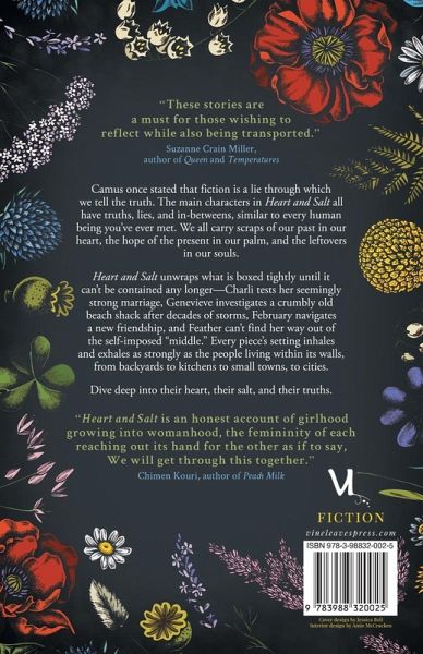 Camus once stated that fiction is a lie through which we tell the truth. The main characters in Heart and Salt all have truths, lies, and in-betweens, similar to every human being you've ever met. We all carry scraps of our past in our heart, the hope of the present in our palm, and the leftovers in our souls. Heart and Salt unwraps what is boxed tightly until it can't be contained any longer-Charli tests her seemingly strong marriage, Genevieve investigates a crumbly old beach shack after decades of storms, February navigates a new friendship, and Feather can't find her way out of the self-imposed "middle." Every piece's setting inhales and exhales as strongly as the people living within its walls, from backyards to kitchens to small towns, to cities. Dive deep into their heart, their salt, and their truths.