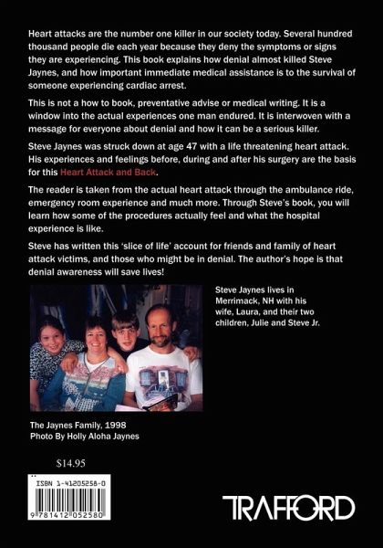 Steven Jaynes lives in Merrimack, New Hampshire with his wife, Laura and their two children, Julie and Steven Jnr. Struck down at age 47 with a life threatening heart attack, his experience and feelings before, during and after the his surgery are the basis for this book. Steve has written this 'slice of life' account for friends and family of heart attack victims. Through Steven's book, you will learn exactly how some of the procedures feel and what the hospital experience is like. The reader is taken through the whole even of actually having the attack, the people who intervene and save his life, the ambulance ride, emergency room experience and much more. It is not a "how to " book, preventative advise or medical writing. It is instead a window in on the actual experiences he endured and its interwoven with a message for everyone about denial and how it is a serious killer. Heart attacks are the number one killer in our society today and several hundred thousand people die each year because they deny the symptoms or signs they are experiencing. This book explains how denial almost killed the author and how important immediate medical assistance is to the survival of someone experiencing cardiac arrest. The author's hope is that denial awareness will save lives!