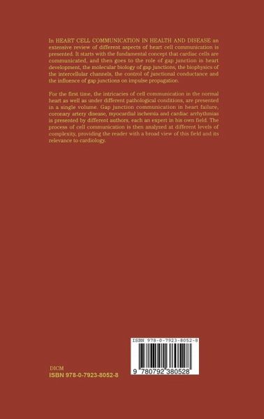 In Heart Cell Communication in Health and Disease an extensive review of different aspects of heart cell communication is presented. The book starts with the fundamental concept that cardiac cells are communicated, and then proceeds to the role of gap junctions in heart development, the molecular biology of gap junctions, the biophysics of the intercellular channels, the control of junctional conductance and the influence of gap junctions on impulse propagation.