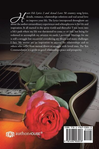 Heart Felt Lyrics 2 and Actual Love: 50 country song lyrics, details, romance, relationships solutions and real actual love to improve your life. The lyrics interspersed throughout are about the author extraordinary experiences and schizophrenia in his life and inspiration. It all started in the spirit world and thereafter I was born into a life's path where my life was threatened to come to an end, but being for ordained to accomplish my mission on earth I persisted. Marriage for me is still a struggle but successful considering my illness and many challenges I face. My stories are an inspiration to anyone for relationships and to others who suffer from mental illness or struggle with loved ones. The Ten Commandment is a guide to good relationships peace and prosperity.