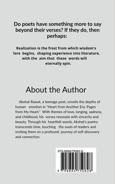'A book must be the axe for the frozen sea within us.' This collection serves as a potent tool for breaking through life's frozen layers. It connects hearts across eras by navigating the depths of teenage experiences and childhood nostalgia through personal, heartfelt poetry. These verses, which switch between the author's young and elderly perspectives on life's journey, are incredibly insightful and poignant. "Heart from Another Era: Pages Friom My Heart" delves into profound philosophies of life, offering insights that illuminate personal introspection and empathy towards others. From the naive viewpoints of youth to the reflective gaze of an experienced soul, the author skillfully captures the essence of every stage of life in poetic form. This collection uses vivid language and a distinct narrative voice to take the readers on a journey of self-discovery and profound human connection. Its sincere words weave an emotional tapestry that piques interest and encourages reflection. Every poem expresses universal truths and introspective insights, whether it is rejoicing in childhood or pondering existential issues. In addition to captivating with its poetic skill, "Heart from Another Era: Pages From My Heart" enriches readers by evoking empathy, fostering introspection, and instilling a fresh appreciation for the beauty found within life's complex journey.
