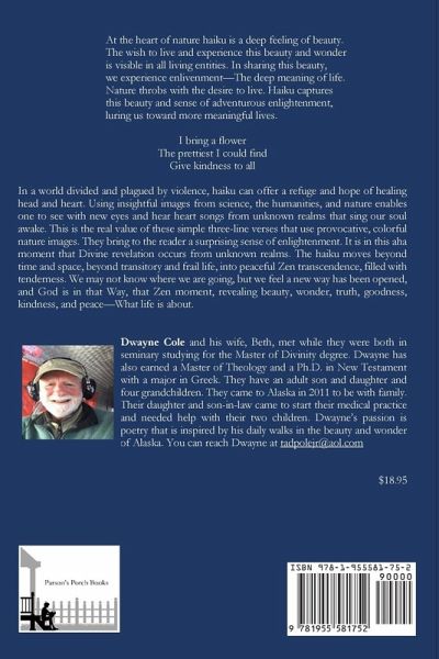 At the heart of nature haiku is a deep feeling of beauty. The wish to live and experience this beauty and wonder is visible in all living entities. In sharing this beauty, we experience enlivenment-The deep meaning of life. Nature throbs with the desire to live. Haiku captures this beauty and sense of adventurous enlightenment, luring us toward more meaningful lives. I bring a flower The prettiest I could find Give kindness to all In a world divided and plagued by violence, haiku can offer a refuge and hope of healing head and heart. Using insightful images from science, the humanities, and nature enables one to see with new eyes and hear heart songs from unknown realms that sing our soul awake. This is the real value of these simple three-line verses that use provocative, colorful nature images. They bring to the reader a surprising sense of enlightenment. It is in this aha moment that Divine revelation occurs from unknown realms. The haiku moves beyond time and space, beyond transitory and frail life, into peaceful Zen transcendence, filled with tenderness. We may not know where we are going, but we feel a new way has been opened, and God is in that Way, that Zen moment, revealing beauty, wonder, truth, goodness, kindness, and peace-What life is about. Dwayne Cole and his wife, Beth, met while they were both in seminary studying for the Master of Divinity degree. Dwayne has also earned a Master of Theology and a Ph.D. in New Testament with a major in Greek. They have an adult son and daughter and four grandchildren. They came to Alaska in 2011 to be with family. Their daughter and son-in-law came to start their medical practice and needed help with their two children. Dwayne's passion is poetry that is inspired by his daily walks in the beauty and wonder of Alaska. You can reach Dwayne at tadpolejr@aol.com