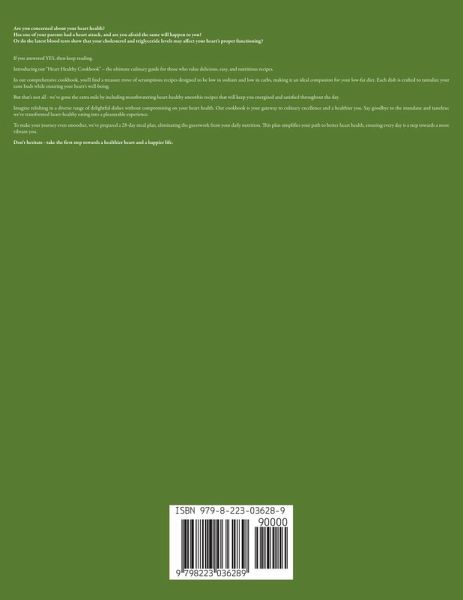 Are you concerned about your heart health? Has one of your parents had a heart attack, and are you afraid the same will happen to you? Or do the latest blood tests show that your cholesterol and triglyceride levels may affect your heart's proper functioning? If you answered YES, then keep reading. Introducing our "Heart Healthy Cookbook" - the ultimate culinary guide for those who value delicious, easy, and nutritious recipes. In our comprehensive cookbook, you'll find a treasure trove of scrumptious recipes designed to be low in sodium and low in carbs, making it an ideal companion for your low-fat diet. Each dish is crafted to tantalize your taste buds while ensuring your heart's well-being. But that's not all - we've gone the extra mile by including mouthwatering heart-healthy smoothie recipes that will keep you energized and satisfied throughout the day. Imagine relishing in a diverse range of delightful dishes without compromising on your heart health. Our cookbook is your gateway to culinary excellence and a healthier you. Say goodbye to the mundane and tasteless; we've transformed heart-healthy eating into a pleasurable experience. To make your journey even smoother, we've prepared a 28-day meal plan, eliminating the guesswork from your daily nutrition. This plan simplifies your path to better heart health, ensuring every day is a step towards a more vibrant you. Don't hesitate - take the first step towards a healthier heart and a happier life.