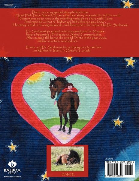 Dante is a very special story-telling horse. Heart Hole Piece Named Horse is the first story he wanted to tell the world. Dante wants us to honour the twinkling heritage we share with Horse, And reminds us that "Children are half stars too you know". His story is told in his original words, and illustrated at his request by Dr. Seabrook.