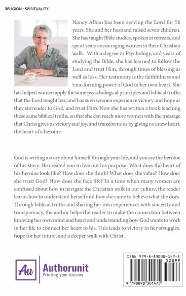 God is writing a story about Himself through your life, and you are the heroine of His story. He created you to live out His purpose. What does the heart of His heroine look like? What does she think? What does she value? How does she trust God? How does she face life? In a time when many women are confused about how to navigate the Christian walk in our culture, the reader learns how to understand herself and how she came to believe what she does. Through biblical truths and sharing her own experiences with sincerity and transparency, the author helps the reader to make the connection between knowing her own mind and heart and understanding how God wants to work in her life to connect her heart to His. This leads to victory in her struggles, hope for her future, and a deeper walk with Christ. Nancy Albao has been serving the Lord for 50 years. She has taught Bible studies, spoken at retreats, and spent years encouraging women in their Christian walk. With a degree in Psychology and years of studying the Bible, she has learned to follow the Lord and trust Him through times of blessing and times of loss. Her testimony is the faithfulness and transforming power of God in her own heart. She has helped apply the same psychological principles and biblical truths that the Lord taught her and has seen women experience victory and hope as they surrender to God and trust Him. Now she has written a book teaching these same biblical truths so that she can reach more women with the message that Christ gives us victory and joy and transforms us by giving us a new heart, the heart of a heroine.