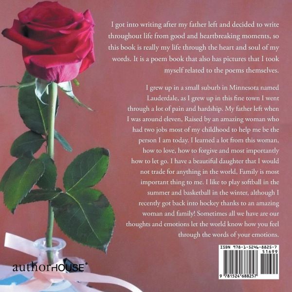 I got into writing after my father left and decided to write throughout life from good and heartbreaking moments, so this book is really my life through the heart and soul of my words. It is a poem book that also has pictures that I took myself related to the poems themselves.