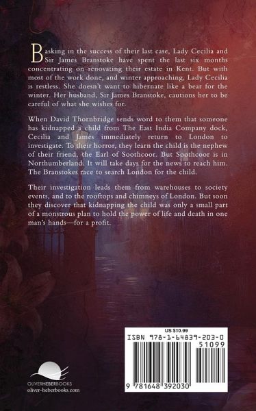Basking in the success of their last case, Lady Cecilia and Sir James Branstoke have spent the last six months concentrating on renovating their estate in Kent. But with most of the work done, and winter approaching, Lady Cecilia is restless. She doesn't want to hibernate like a bear all winter, but her husband cautions her to be careful what she wishes for. When David Thornbridge sends word to them that someone has kidnapped a child from The East India Company dock, Cecilia and James immediately return to London to investigate. To their horror, they learn the child is the nephew of their friend, the Earl of Soothcoor. But Soothcoor is in Northumberland. It will take days for the news to reach him. The Branstokes race to search London for the child. Their investigation leads them from warehouses to society events, and to the rooftops and chimneys of London. But soon they discover that kidnapping the child was only a small part of a monstrous plan to hold the power of life and death in one man's hands-for a profit.