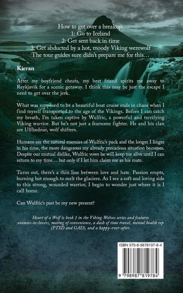 How to get over a breakup: 1: Go to Iceland 2: Get sent back in time 3: Get abducted by a hot, moody Viking werewolf The tour guides sure didn't prepare me for this... Kieran After my boyfriend cheats, my best friend spirits me away to Reykjavik for a scenic getaway. I think this may be just the escape I need to get over the jerk. What was supposed to be a beautiful boat cruise ends in chaos when I find myself transported to the age of the Vikings. Before I can catch my breath, I'm taken captive by Wulfric, a powerful and terrifying Viking warrior. But he's not just a fearsome fighter. He and his clan are Ulfhednar, wolf shifters. Humans are the natural enemies of Wulfric's pack and the longer I linger in his time, the more dangerous my already precarious situation becomes. Despite our mutual dislike, Wulfric vows he will keep me alive until I can return to my time... but only if I let him claim me as his mate. Turns out, there's a thin line between love and hate. Passion erupts, burning hot enough to melt the glaciers. As I see a soft and loving side to this strong, wounded warrior, I begin to wonder just where it is I call home. Can Wulfric's past be my new present? Heart of a Wolf is book 1 in the Viking Wolves series and features enemies-to-lovers, mating of convenience, a dash of time travel, mental health rep (PTSD and GAD), and a happy-ever-after.